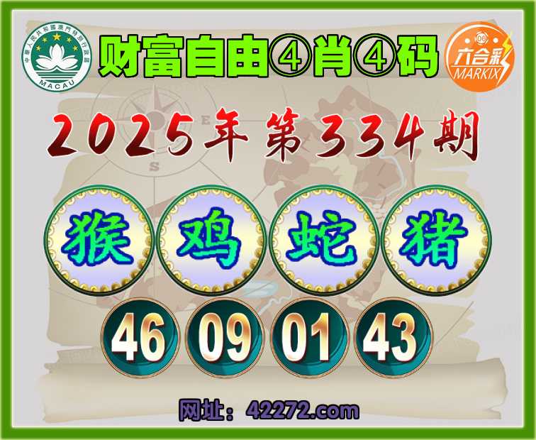 334期:〖财富自由〗 ④肖④码【猴鸡蛇猪】【46.09.01.43】开:猴46准见证上榜